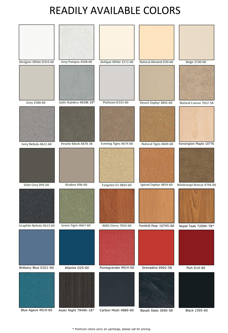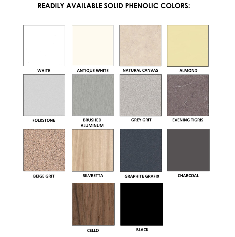 Color selections also from Trespa, Arborite, Formica, Pionite & Nevamar, or any other sources specified by the customer.