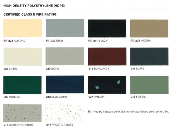 Hadrian’s solid plastic partitions offer the utmost in strength and durability. Available in High Density PolyEthylene (HDPE) material, doors, panels and pilasters are all 1” (25mm) thick. Our commitment is to take an industry standard and make it better through outstanding service. With reliable lead times and exceptional shipping programs, Hadrian’s solid plastic partitions are a fantastic value.